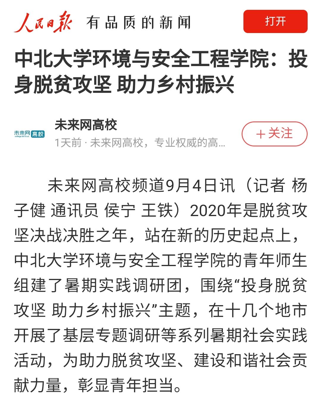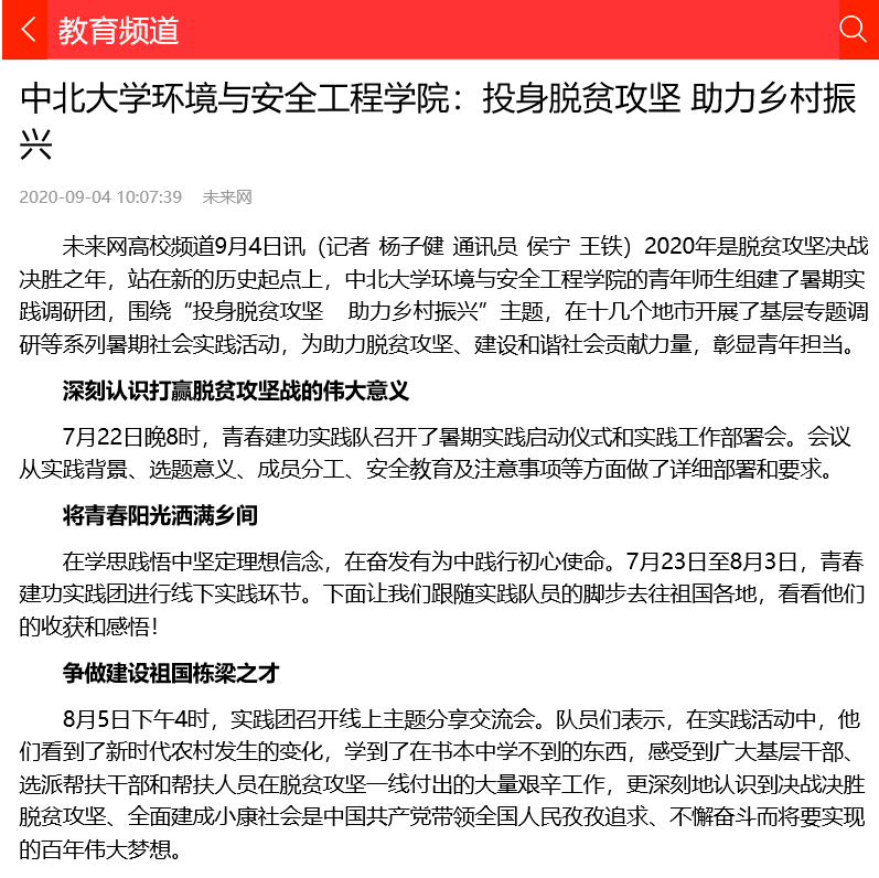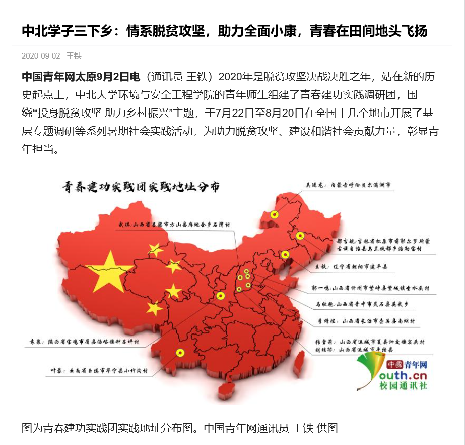 9月2日,《中国青年网》以《中北学子三下乡:情系脱贫攻坚,助力全面小康,青春在田间地头飞扬》为题,对此进行了报道。同时,人民日报新媒体平台、未来网、今日头条、山西青年报、中北大学网媒体聚焦栏目等从不同角度不同视野报道了我院学生的实践工作。