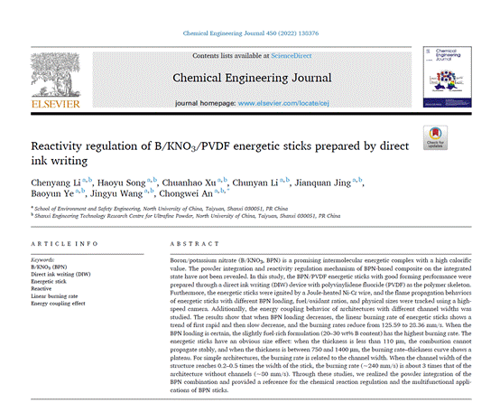 近日,我校环境与安全工程学院兵器科学与技术学科博士研究生李晨阳在Chemical Engineering Journal期刊发表了题为“Reactivity regulation of B/KNO3/PVDF energetic sticks prepared by direct ink writing”科研论文,中北大学为论文唯一单位,安崇伟教授为论文通讯作者。论文首次采用3D微笔直写技术实现了高固含量B/KNO3(BPN)点火药含能油墨的集成化可控构筑,研究了BPN在线性集成状态下的化学释能规律,揭示了含能构件间的能量耦合作用机制,确定了BPN含能药线“组配-结构”双重路径的反应性调控方法,为含能器件的设计提供了基础理论支撑。