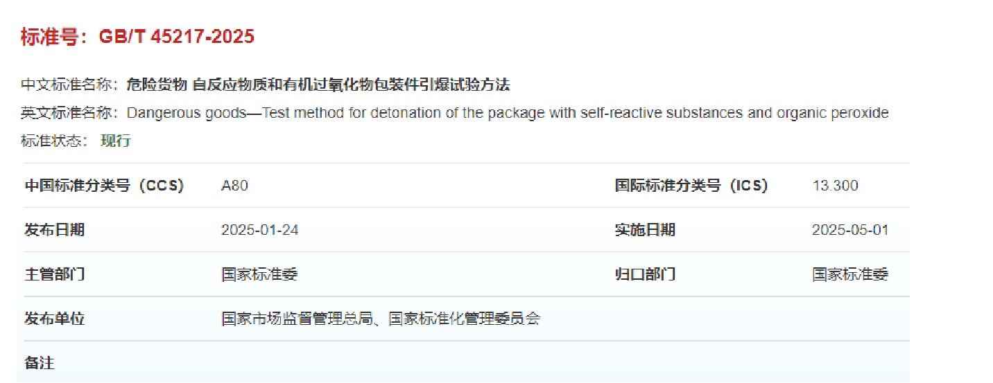 2025年5月,国家标准(编号:GB/T 45217-2025)《危险货物 自反应物质和有机过氧化物包装件引爆试验方法》正式批准发布。该标准于2022年下达了标准制定计划(计划号为20221514-T-469),由我院安全科学与工程学科曹卫国教授团队牵头,联合南京理工大学、安徽理工大学等多家高校以及应急管理部化学品登记中心等行业优势单位历时2年多完成。标准引领,赋能安全科学与工程学科在危险化学品产业高质量发展,助力我校“双一流”建设。该成果是我校安全学科成立40年来牵头起草的首个“GB开头”国家标准,也是我校近8年唯一1项牵头起草的国家标准。