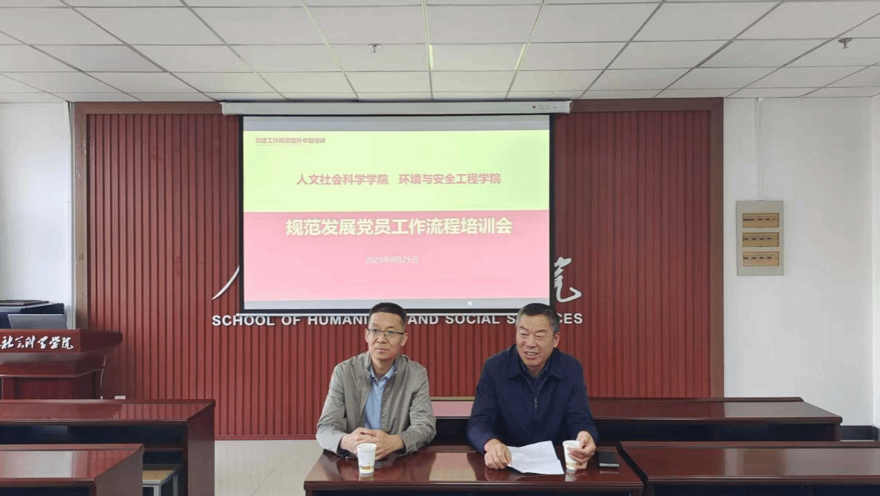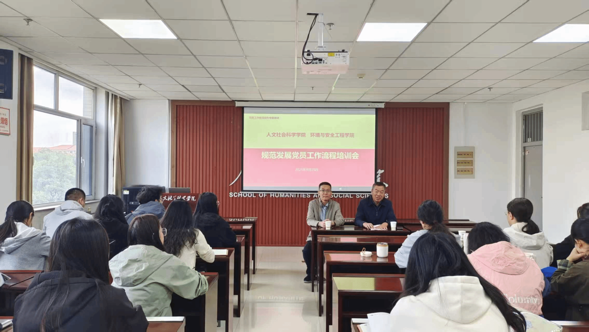 为严格落实新时代党的建设总要求,进一步规范发展党员工作程序、提升工作质量,9月25日上午,环境与安全工程学院与人文社会科学学院共同举办规范发展党员工作流程专题培训会。环境与安全工程学院党委书记王振荣、人文社会科学学院党委书记孙俊伟、组织员以及各学生党支部书记参加会议。