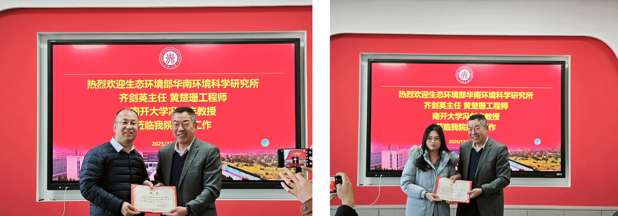 12月16日,生态环境部华南环境科学研究所(以下简称华南所)研究室主任齐剑英研究员,黄楚珊高级工程师、南开大学冯剑丰教授一行3人莅临我院交流。学院党委书记王振荣、党委副书记张少明及环境工程专业相关教师参加了交流会。