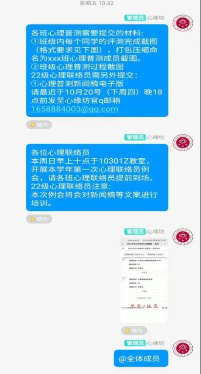我院此次心理普测以班级为单位,通过网上开展心理测评。我院心缘坊老师首先就测评流程以及注意事项在心理联络员群内进行了详细的说明。心理联络员及班主任同时对测评过程中同学们所遇到的问题采取相应的解决措施。本次心理普测主要分为心理健康自测量表和大学生心理健康调查表,在此过程中22届的同学们都表现的格外积极与热情。最后,网上心理测评工作于10月20日落下帷幕。完成测评后,将会对于心理存在困难或者不良倾向的同学,我院将会安排相应的老师对其心理疏通和辅导。希望在这次心理普测之后大家可以将用更饱满的精气神面对今后的学习与生活。