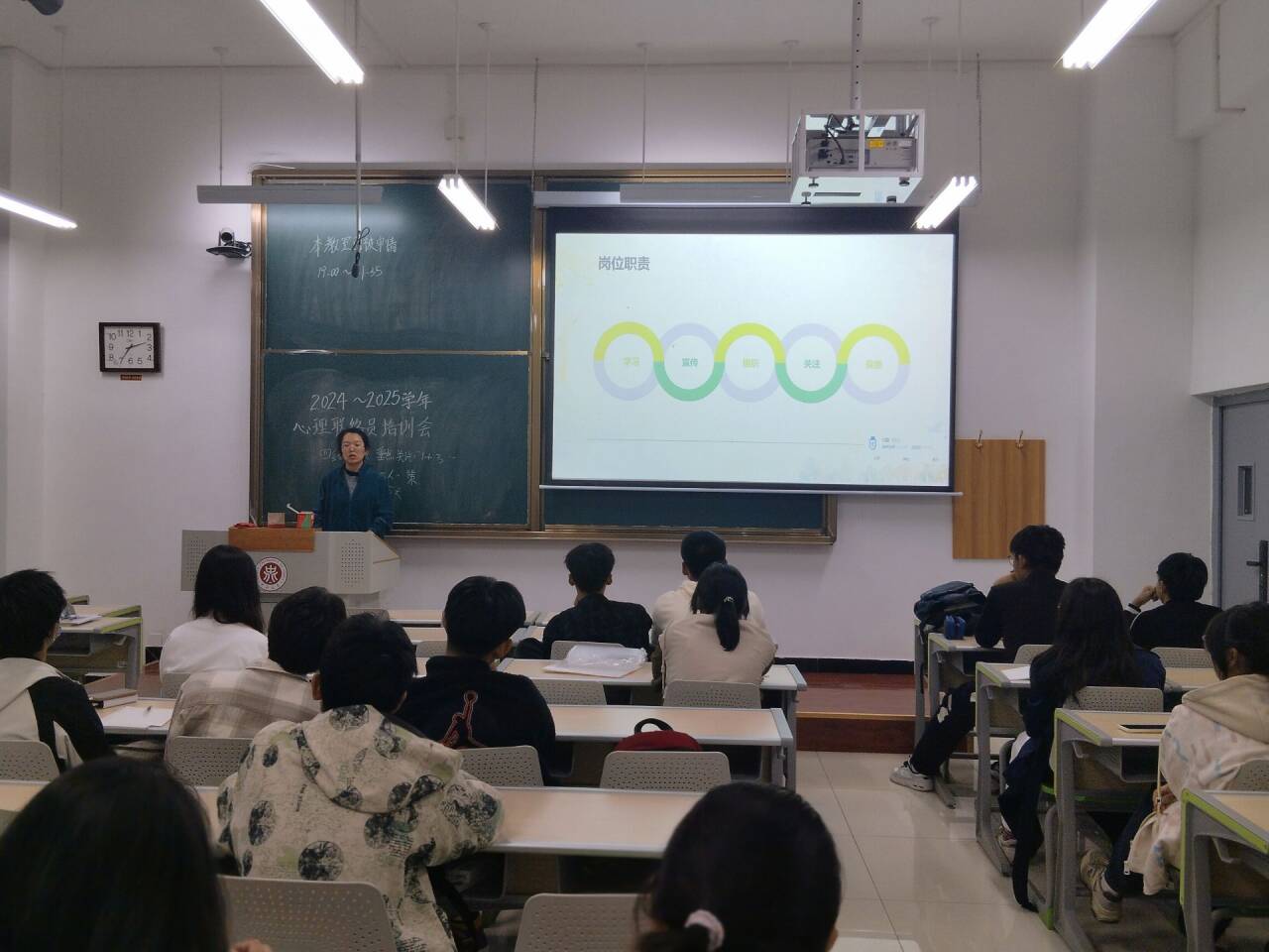 培训会上,谷磊磊老师深入浅出的讲解了心理学的基本理论和实用技巧,还举了大量的真实案例,让心理联络员们清晰的认识到了各种心理问题的隐蔽性和表现形式。同时,老师还着重强调了沟通技巧和倾听能力在心理服务中的关键作用,指导心理联络员们学会与他人建立信任关系,为解决问题创造良好基础。