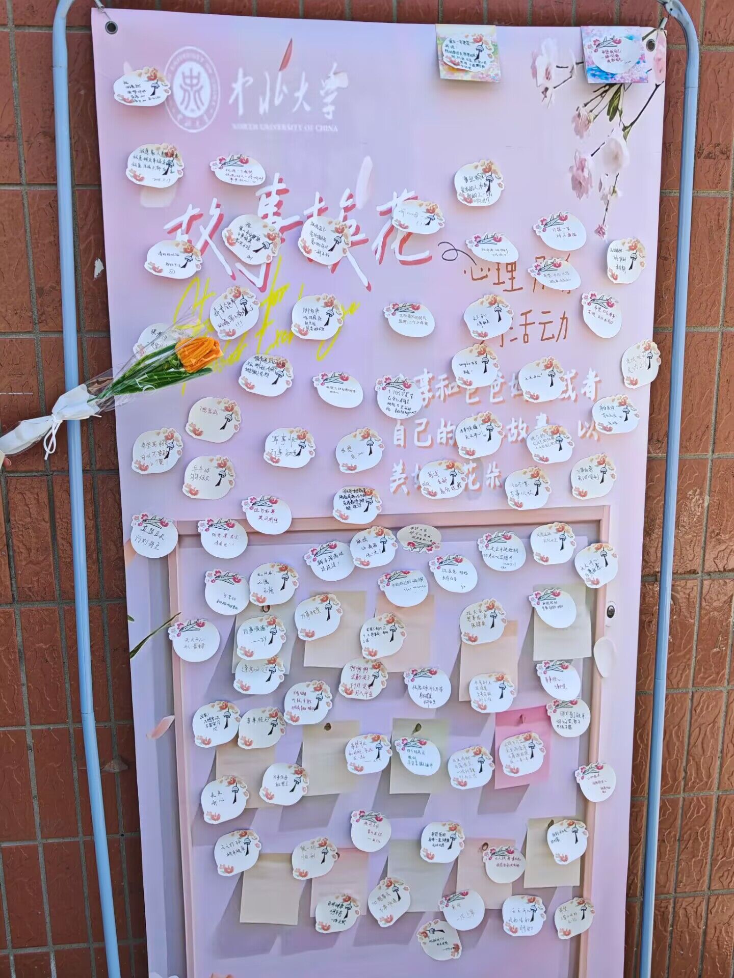 本次活动分为线上和线下两部分,线下活动参与同学通过便利贴记录自己与父母之间温馨故事或者写下自己对未来、学业、父母的祝福,让感恩在纸间流转,换取花朵;或者写下自己对生活的迷茫,由心理站同学进行疏导,并赠予带有激励话语的花朵。线上部分参与同学通过环境与安全工程学院团委心缘坊的邮箱进行投稿,分享自己或和父母的美好瞬间,得到回复及花朵。本次活动在工作人员的引导下有序进行,同学们积极参与,整场活动圆满收尾。