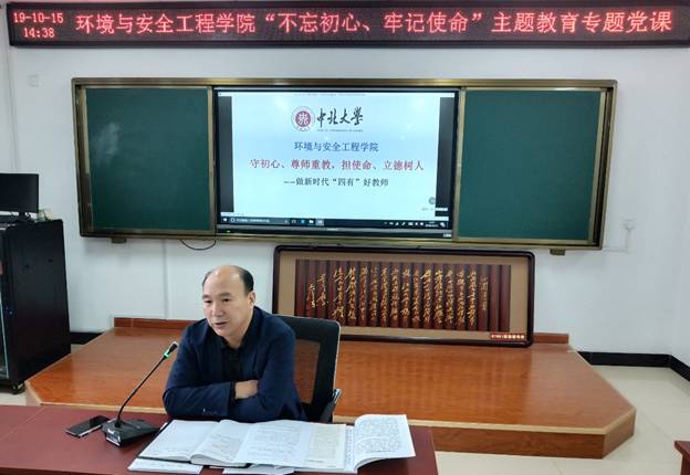 10月15日下午,环境与安全工程学院院党委书记赵树森同志在科学楼C座西901以题为“守初心、尊师重教,担使命、立德树人——做新时代“四有”好教师”为学院全体党员讲“不忘初心,牢记使命”主题教育专题党课。