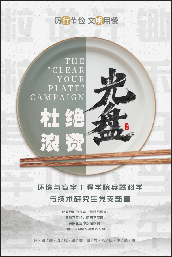 为深入贯彻落实习近平总书记对制止餐饮浪费行为重要指示的精神,响应学校“坚决制止学校餐饮浪费行为”专项行动号召,让勤俭节约的优良传统在我院师生群体中蔚然成风。10月1日至10月10日,环境与安全工程学院兵器科学与技术研究生党支部举办了以拒绝“舌尖浪费”,倡导“光盘行动”为主题的党日活动。
