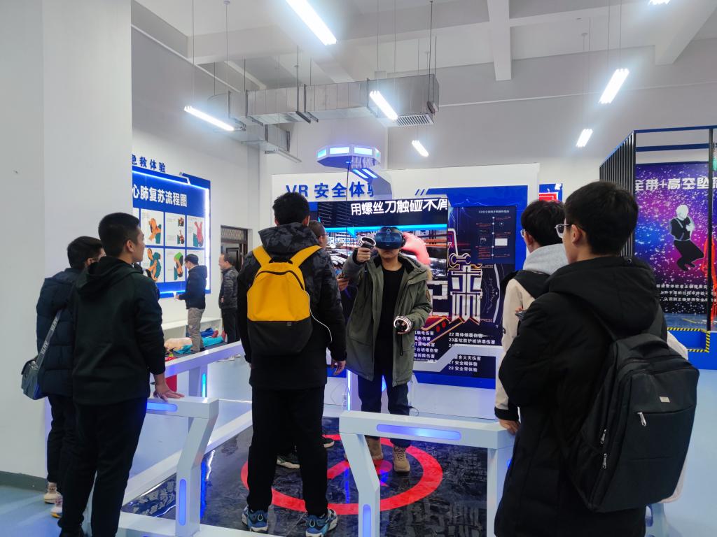 环境与安全工程学院安全体验馆由97级安全工程专业崔正浩校友捐资建设,总面积180平方米,包括VR安全、高空坠落、安全帽撞击、综合用电、灭火器演示、钢丝绳使用、安全急救等体验项目,覆盖了施工、生产、生活中常见的安全隐患。