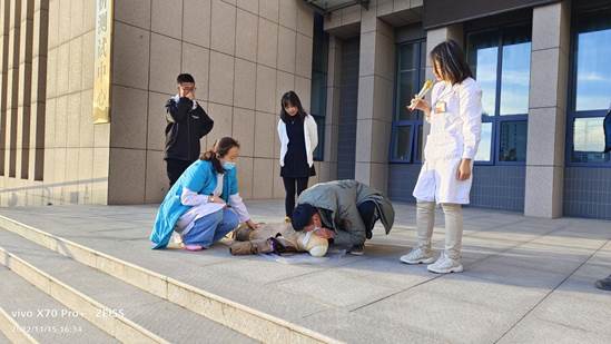 其次,由邢丽霞大夫、张慧护士长现场传授心肺复苏、人工呼吸等急救措施并邀请学生亲自上台体验。