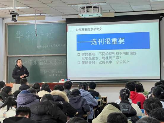 冯教授以如何撰写高水平学术论文为主线,分别从论文的选题、撰写、绘图、投稿等环节为同学们进行了讲解。他指出,想要发表高水平论文必须先阅读足够数量的优质文献,掌握前沿动态,紧跟行业节奏,了解前沿研究,保证选题的新颖。