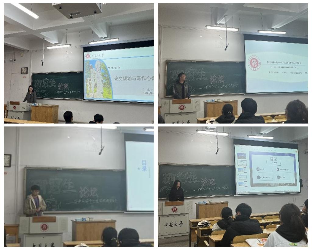 为激发研究生的创新思维意识,提升研究生科学研究能力,2024年10月31日下午4:00,环境与安全工程学院于10203H教室举办“心之所向,行则将至”研究生论坛。本次论坛邀请了2024年国家奖学金获得者博士生张诗敏、硕士生杜瑞、程静、郭泰东,分享他们在科学研究中的心得体会。