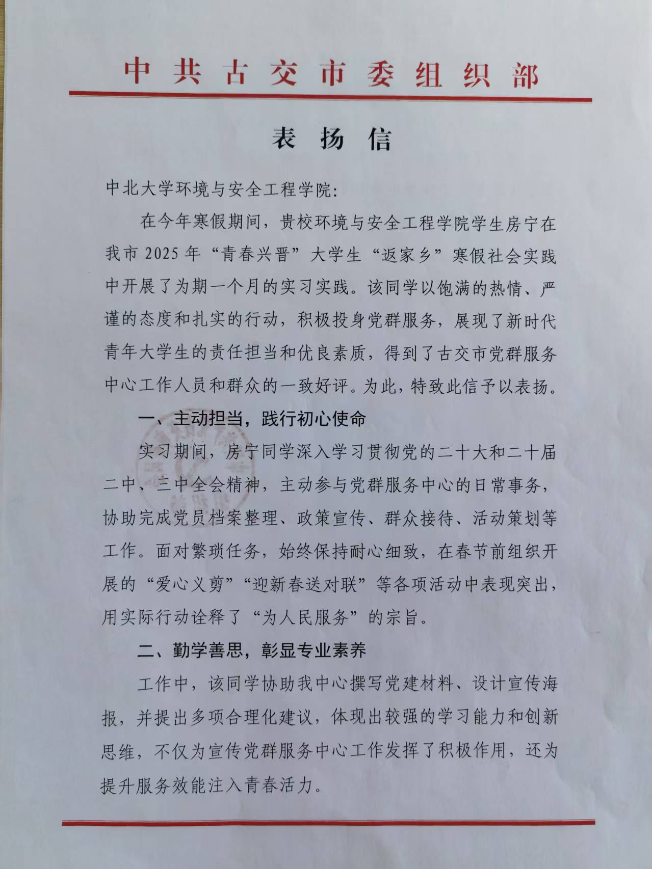 在2025年“青春兴晋”大学生“返家乡”寒假社会实践活动中,我校环境与安全工程学院24140343班学生房宁积极投身古交市党群服务中心实习实践,表现优异,现予以通报表扬。